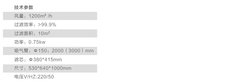 主要部件包括:萬向吸塵臂、耐高溫吸塵軟管、吸塵罩(帶風量調節閥)、阻燃濾筒、帶剎車的新韓式腳輪、風機、進口電機以及電控系統等。