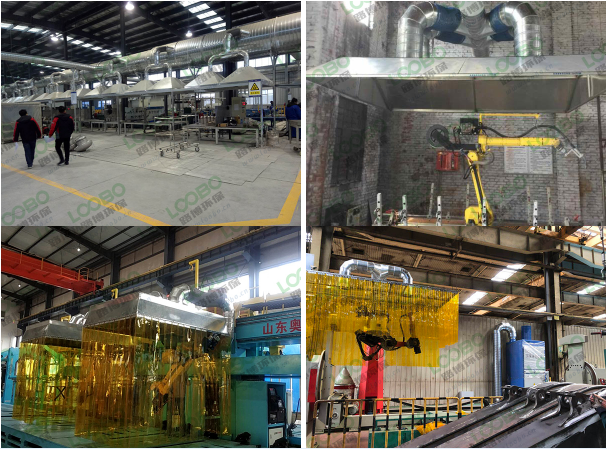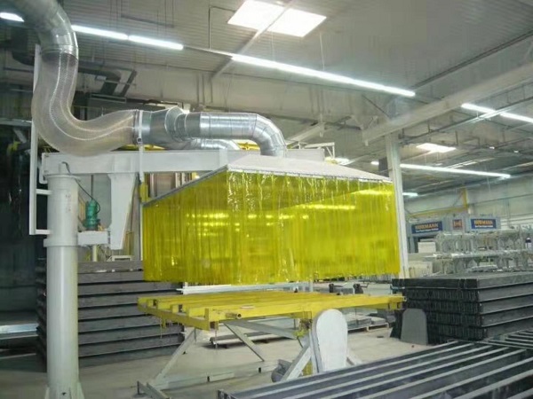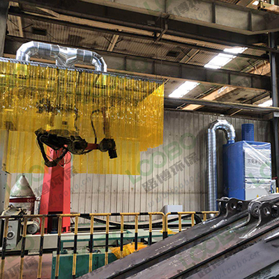 頂吸罩在焊接機器人焊煙收集凈化的應用中也是較為普遍的,頂吸罩這種收集方式有分為固定式頂吸罩,和移動式頂吸罩,固定式頂吸罩使用于沒有行車、行吊等需要吊裝設備的小工件機器人焊接工位;移動式頂吸罩適合于車間內部裝有行車、行吊等需要吊裝的大工件和設備維修等的機器人焊接工位;結合用戶工況及機器人路徑設計頂吸罩的尺寸大小,可在煙氣粉塵擴散范圍內及時將煙氣粉塵收集,目前僅該項收集方式已完成多個成功案例,涉及行業多達幾十個。
